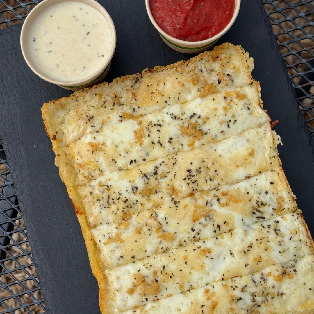 PIZZA DOUGH BAKED WITH MOZZARELLA CHESE BLEND, MINCED GARLIC, FRESH PARMESAN, AND ITALIAN SEASONING SERVED WITH CHOICE OF MARINARA OR ALFREDO
