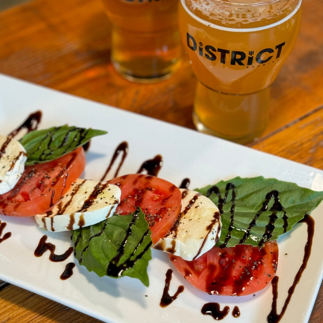 3 SLICES FRESH MOZZARELLA, 3 SLICES TOMATOES, BASIL, OLIVE OIL, BALSAMIC GLAZE