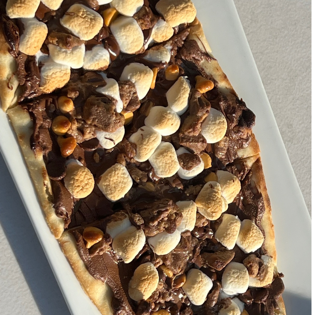 FLATBREAD TOPPED WITH NUTELLA, MARSHMALLOWS, CHOCOLATE CHIPS, BUTTERSCOTCH CHIPS, REESES CUPS, AND GRAHAM CRACKERS