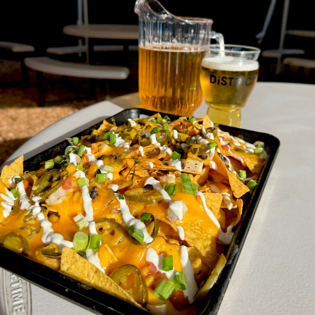 CHOICE OF PROTEIN: PULLED PORK, CHICKEN, OR BRISKET, ROASTED CORN/BLACK BEAN SALSA, JALAPEÑOS, GREEN ONION, AND SOUR CREAM