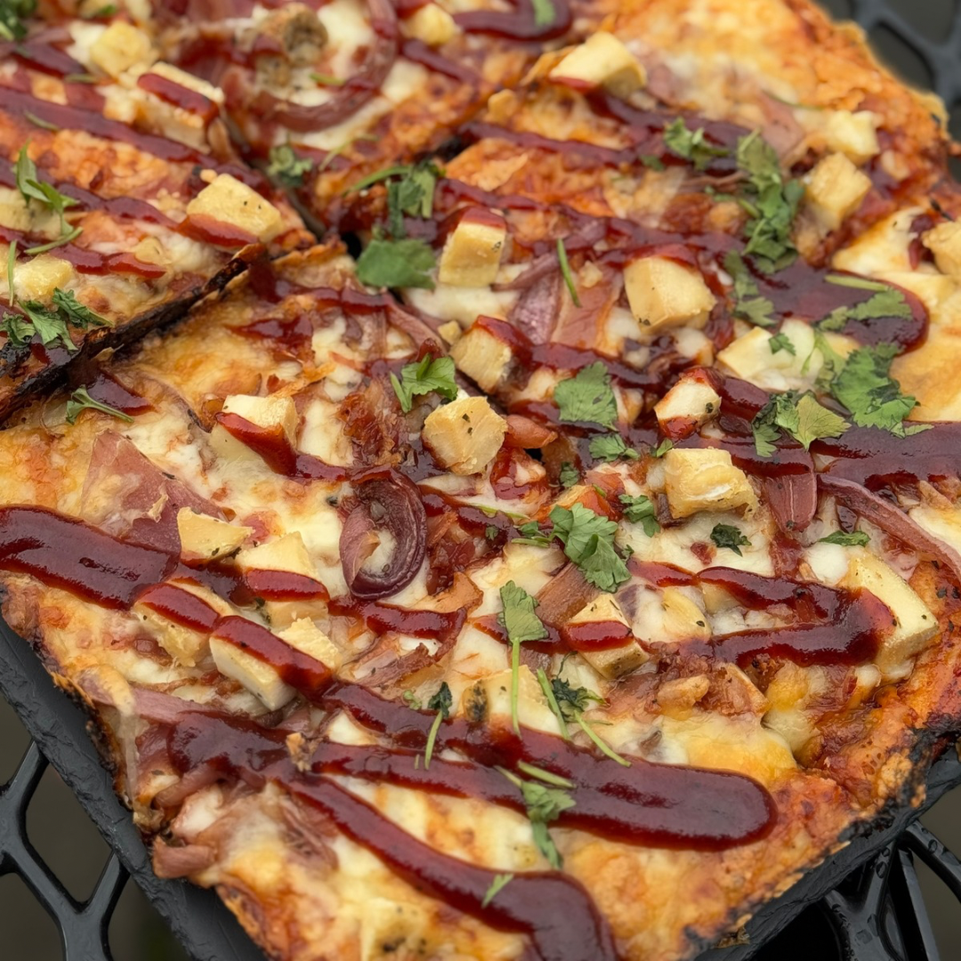 BBQ SAUCE, CHICKEN, BACON, CARAMELIZED ONION, BBQ DRIZZLE, CILANTRO