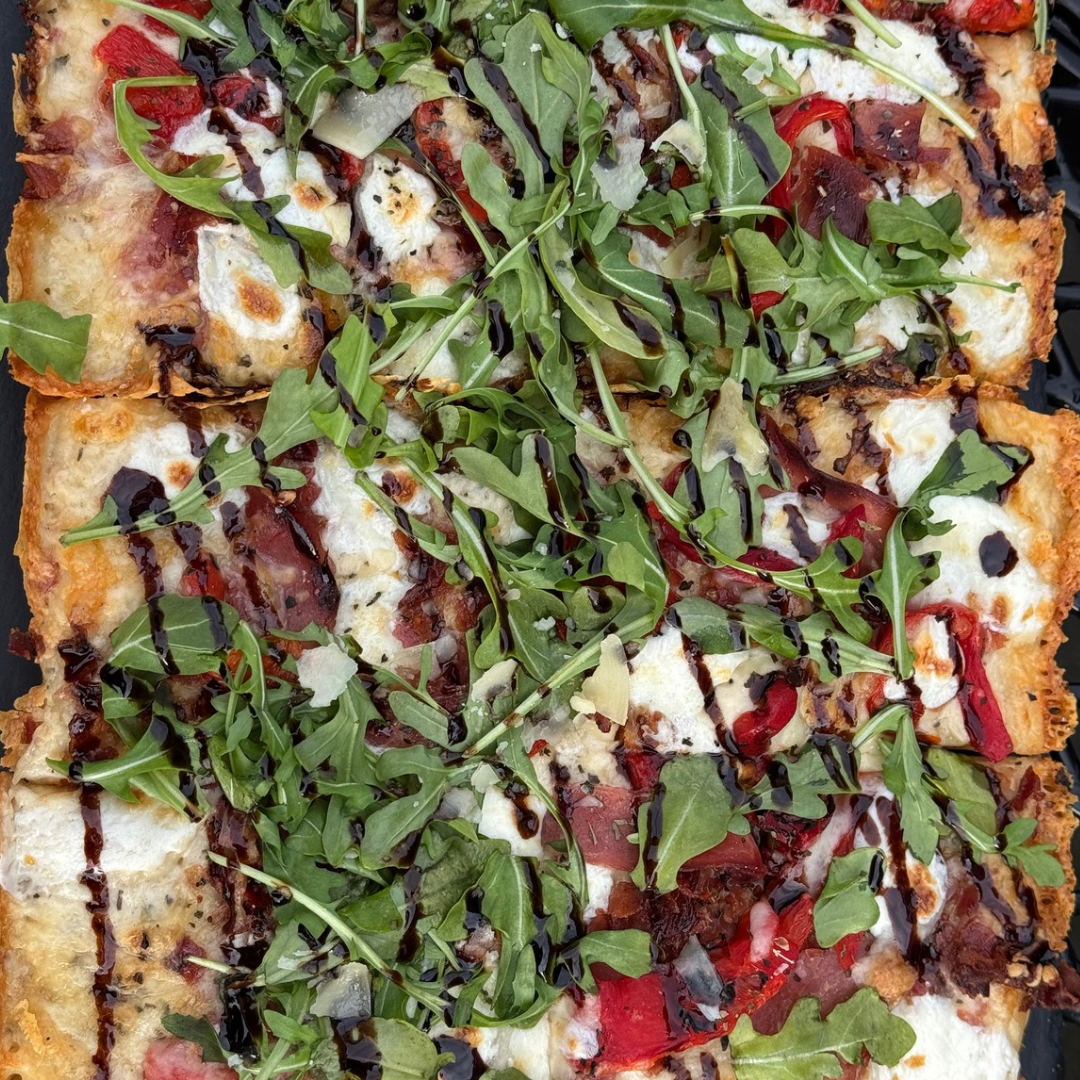 WHITE SAUCE, PROSCIUTTO, BACON, ROASTED RED PEPPERS, ITALIAN SEASONING, ARUGULA, BALSAMIC DRIZZLE, PARMESAN