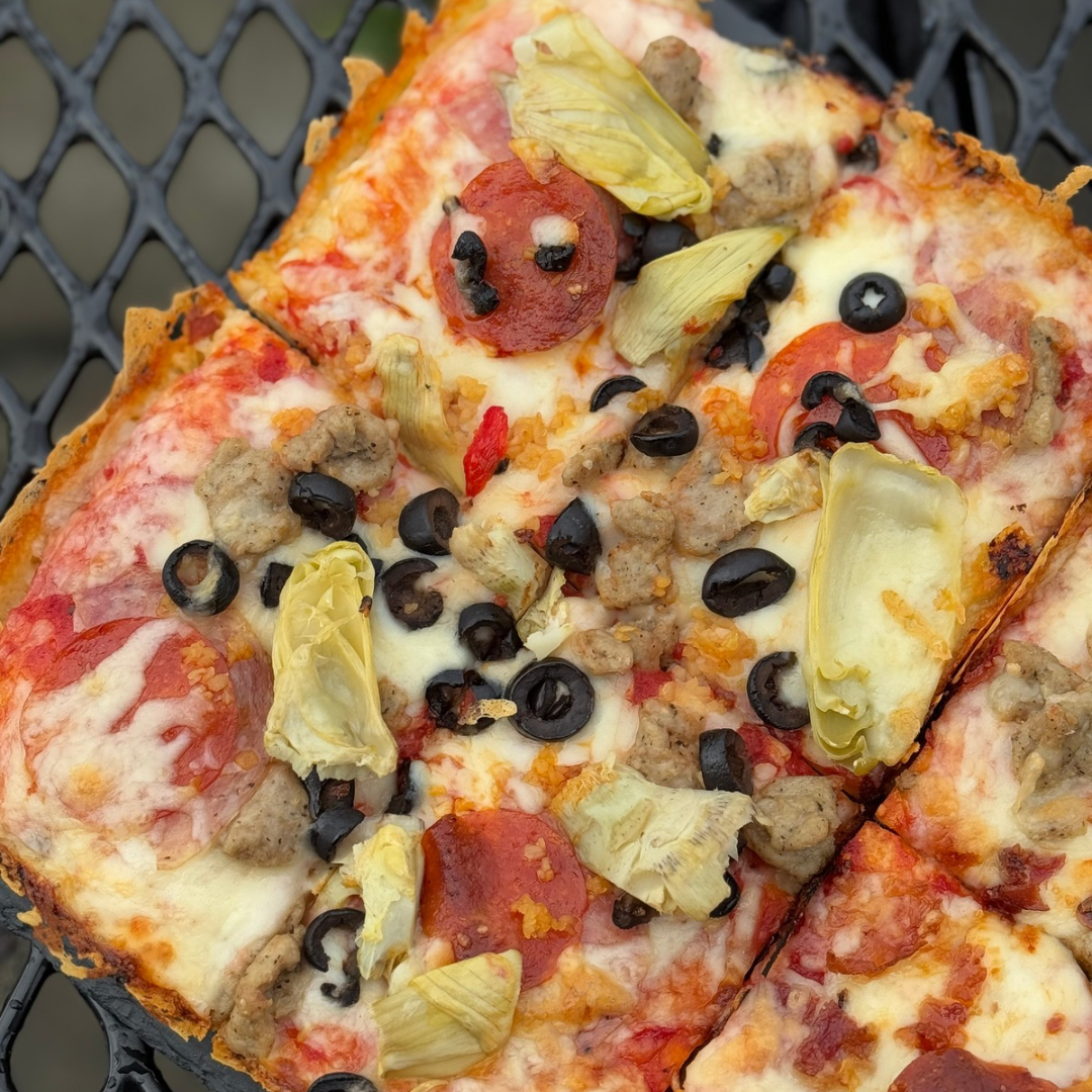 RED SAUCE, PEPPERONI, SALAMI, SAUSAGE, ARTICHOKE HEARTS, BLACK OLIVES, GARLIC
