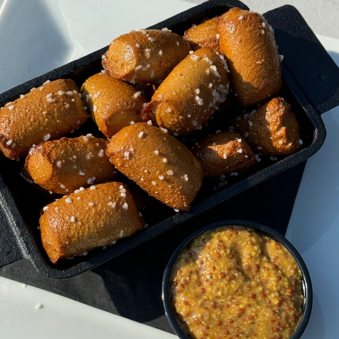 SERVED WITH STONE GROUND MUSTARD ADD CHEESE SAUCE FOR ADDITIONAL COST